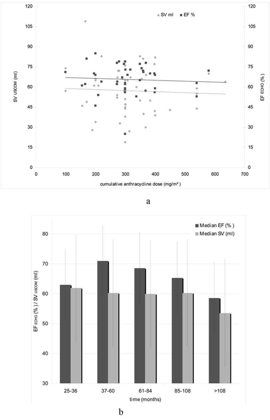 To investigate the relationship between anthracycline therapy and time, patients were divided into five groups depending on the elapsed time after receiving an anthracycline-based regimen and the hemodynamic investigations (25 - 36 months, 37 - 60 months, 61 - 84 months, 85 - 108 months, and > 108 months). The relationship between the time interval after treatment and EF ECHO and SV USCOM is illustrated in Figure 2b.