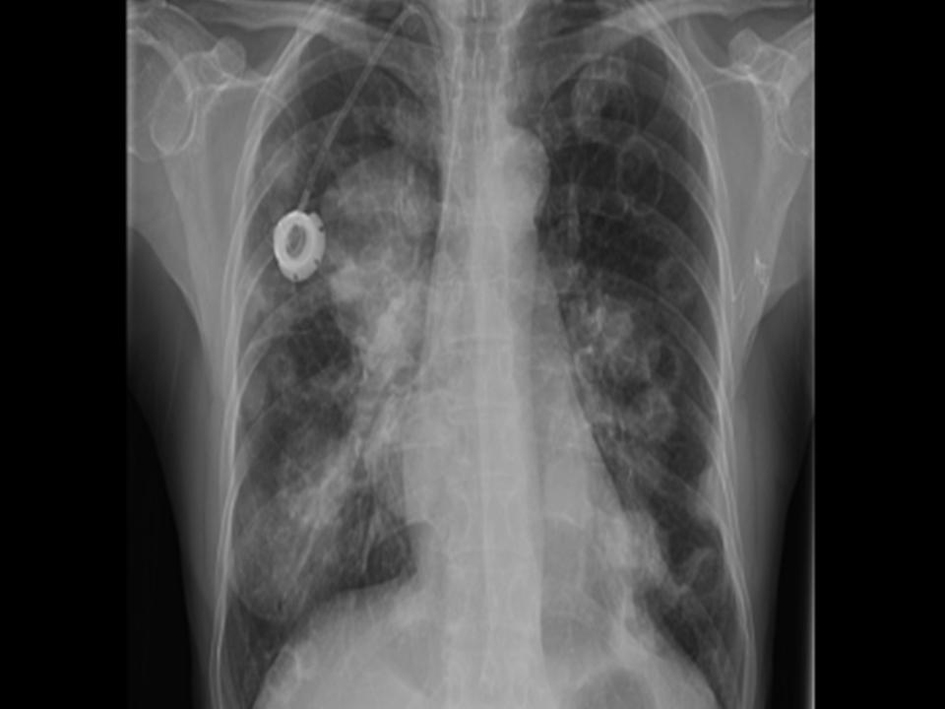 ![]() Click for large image | Figure 1. Chest X-ray showing new multiple bilateral cavitary nodules and focal infiltrates in the lateral aspect of the right upper lobe. |