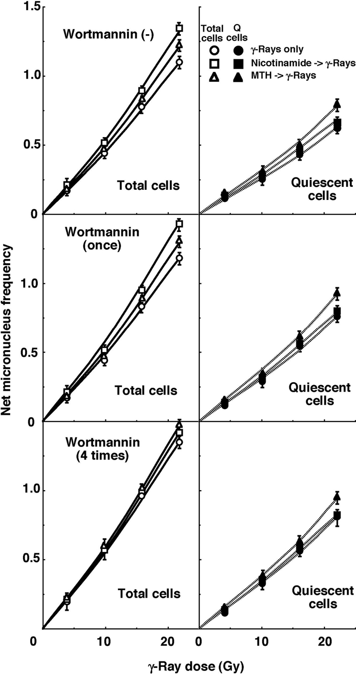 For baseline correction, we used the net MN frequency to exclude the MN frequency in non-irradiated tumors. The net MN frequency was defined as the MN frequency in the irradiated tumors minus that in the non-irradiated tumors. Dose response curves for the net MN frequency in total and Q tumor cell populations as a function of radiation dose are shown in Figure 2. Overall, the net MN frequencies were significantly lower in the Q cells than the total cell population (P < 0.05). In the total cell population treated without wortmannin or with singly administered wortmannin, the net MN frequency increased in the following order: after γ-ray irradiation alone < after γ-ray irradiation following MTH < after γ-ray irradiation following nicotinamide administration. In the total cell population with daily administered wortmannin and Q cell populations with or without wortmannin administration, the net MN frequency increased in the order, after γ-ray irradiation alone < after γ-ray irradiation following nicotinamide administration < after γ-ray irradiation following MTH.