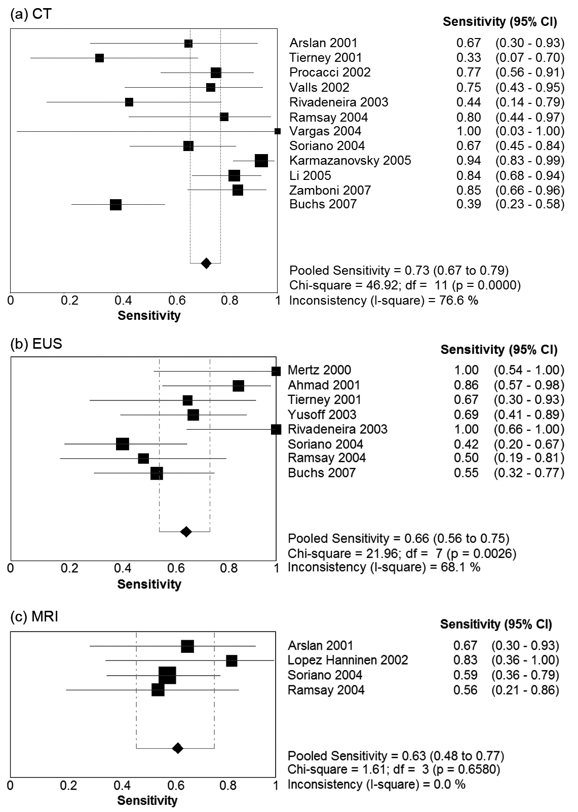 ![]() Click for large image | Figure 1. Forest plots of sensitivity Pooled results for sensitivity of (a) CT, (b) EUS, and (c) MRI in detection of vascular invasion in pancreatic adenocarcinoma. The limits of the diamond represent the 95% confidence interval of the pooled estimate. |