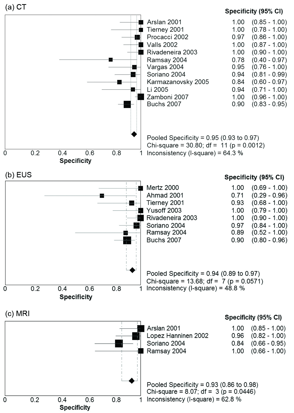 ![]() Click for large image | Figure 2. Forest Plots of specificity Pooled results for specificity of (a) CT, (b) EUS, and (c) MRI in detection of vascular invasion in pancreatic adenocarcinoma. The limits of the diamond represent the 95% confidence interval of the pooled estimate. |