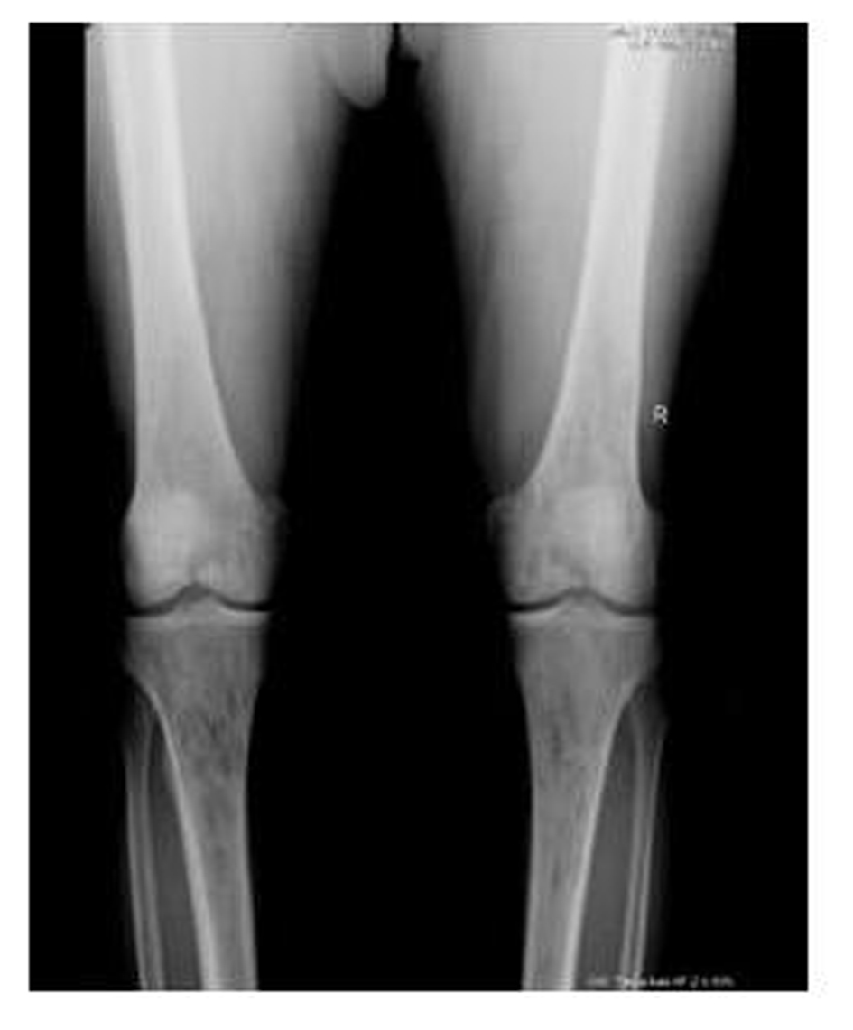 ![]() Click for large image | Figure 1. Radiolucent and osteolytic lesions with irregular margins were seen in bone structures of both knee joint’s epiphysis, metaphysis and diaphysis. |