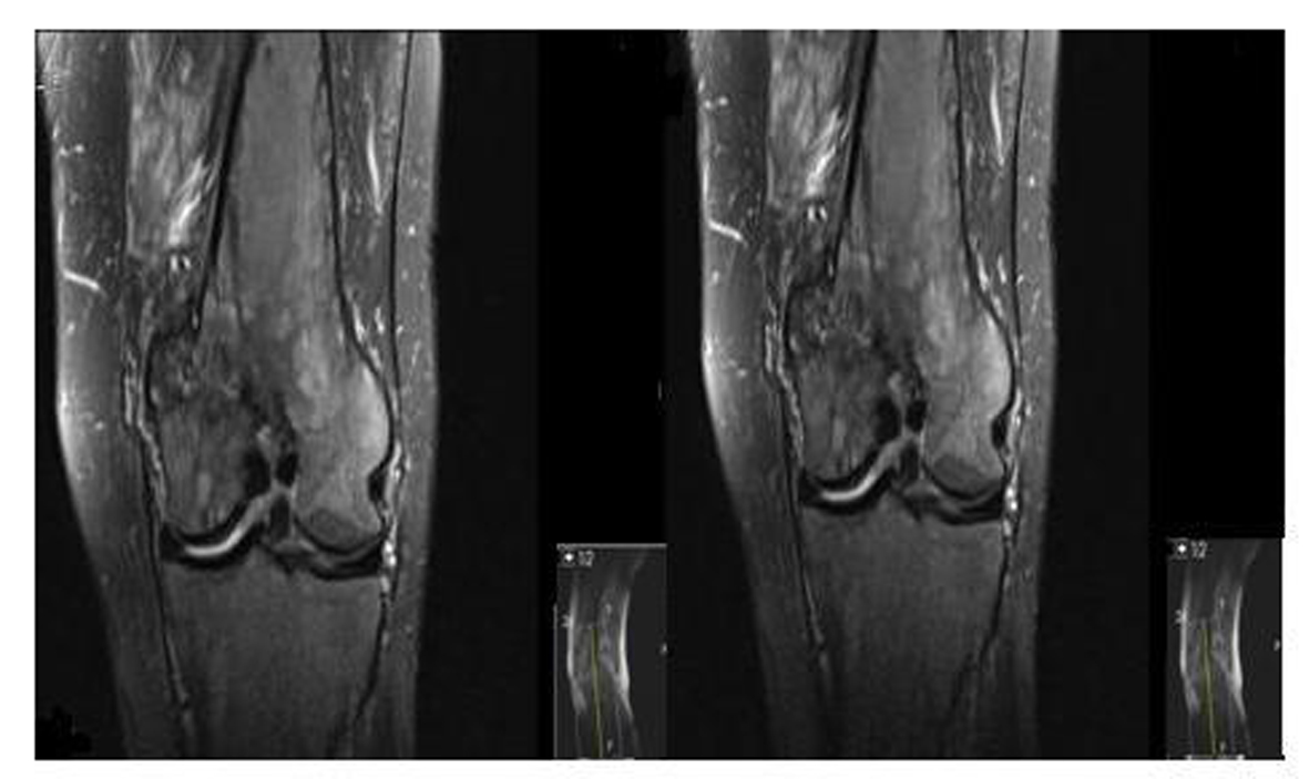 Disease response is categorized to four groups; No evidence of active disease, complete resolution of all signs and symptoms, continuous regression; signs and/or symptoms are less prominent with no new lesions, Stable disease; persistence of signs and/or symptoms, Progressive disease; progression of signs/symptoms and/or appearance of new signs/symptoms [10]. After 6 weeks of vinblastine plus prednisolone treatment, knee MRI was applied and progression was seen in our patient.