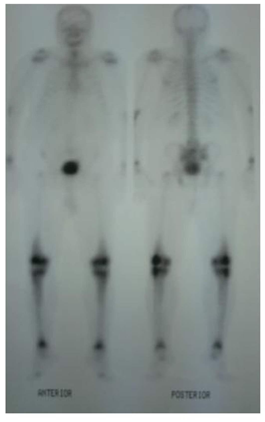 ![]() Click for large image | Figure 3. Increased osteoblastic activity was detected in bilateral proximal and distal tibia by whole-body bone scintigraphy. |