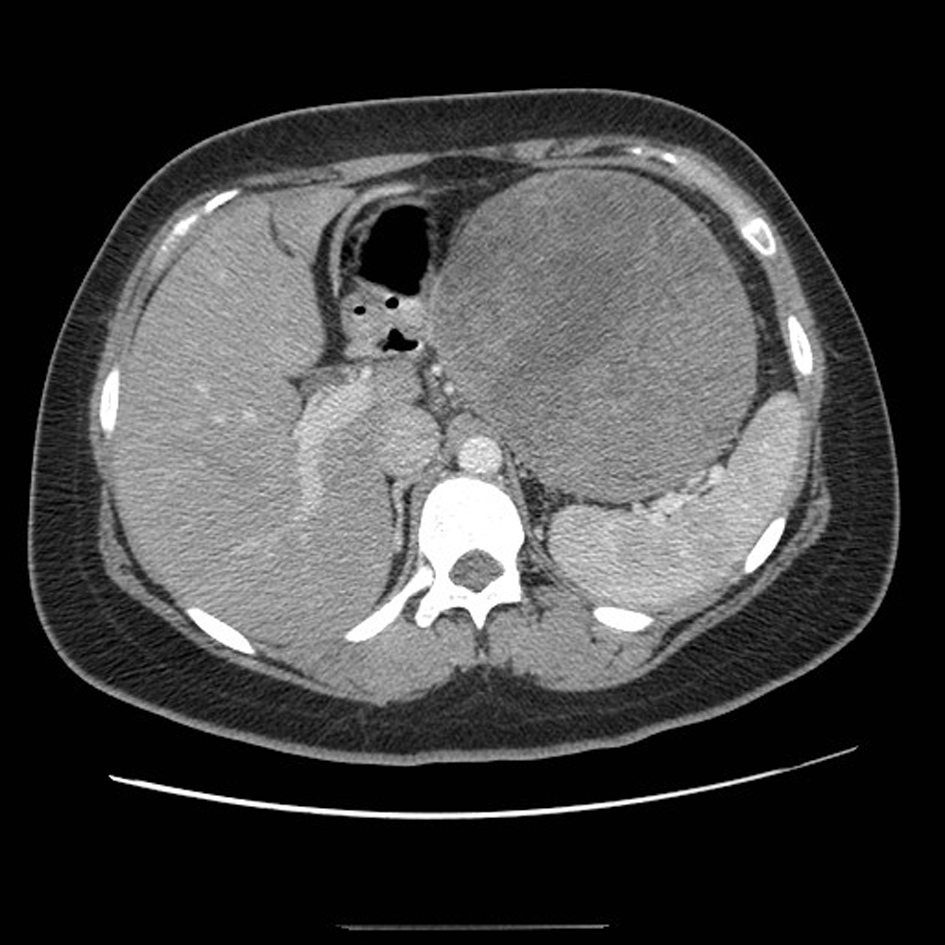 ![]() Click for large image | Figure 1. CT scan of the abdomen demonstrating a large mass arising from the tail of the pancreas. |