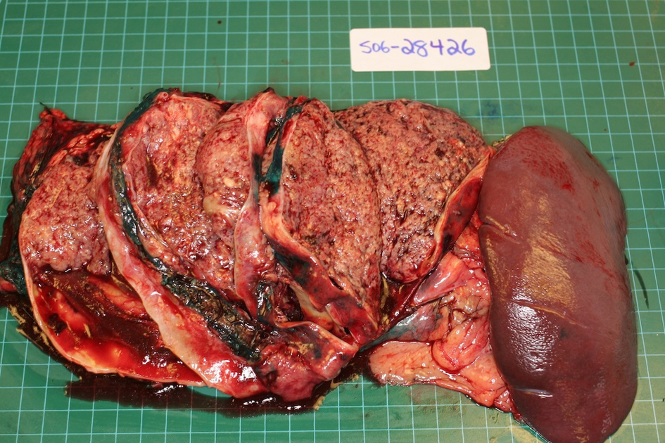 ![]() Click for large image | Figure 2. Surgical specimen demonstrating large tumor in the tail of the pancreas with prominent cystic degeneration. |