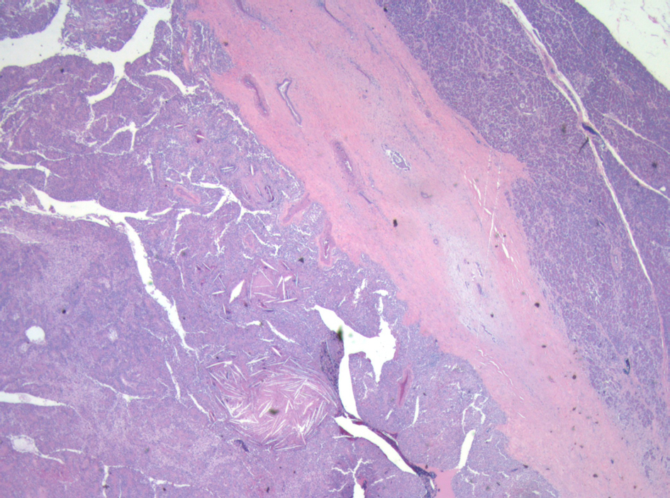 ![]() Click for large image | Figure 3. Low power micrograph showing normal pancreas (right) and tumor (left). Note cholesterol clefts in tumor. |