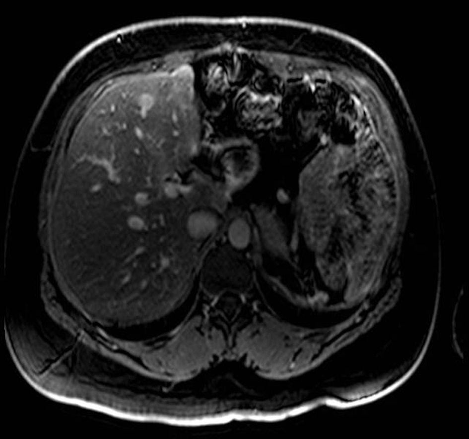 ![]() Click for large image | Figure 4. MRI with gadolinium contrast demonstrating a metastases in segment 4 of the liver. |