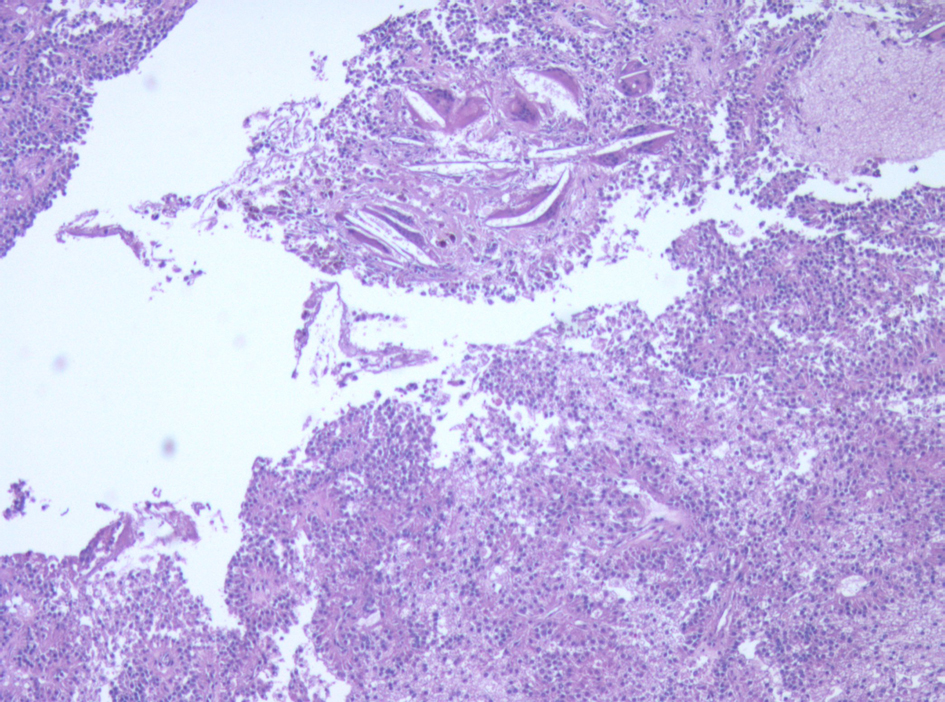 Surveillance AUS was performed biannually, then annually. A surveillance AUS performed 43 months post-operatively demonstrated fatty transformation of the liver with a discrete hypoechoic lesion measuring 1.1 × 1.0 × 0.8 cm in segment 4B/5 of the liver. There was no evidence of local recurrence. The patient was asymptomatic, with no focal findings on physical exam. Laboratory studies including liver function tests were within normal limits. Magnetic Resonance Imaging (MRI) demonstrated a 1-cm lesion in segment 4B, and a 0.8 cm lesion in segment 5 of the liver (Fig. 4). Both lesions demonstrated intermediate high signal on T2 weighted images and progressive enhancement after gadolinium injection. They demonstrated restricted diffusion on diffusion weighted imaging. They were suspicious for metastases, but atypical hemangiomas remained in the differential. In order to narrow this differential, a contrast enhanced ultrasound study was performed, and the lesions demonstrated mild arterial enhancement with rapid complete washout in keeping with metastases. These lesions were not avid on Fluorodeoxyglucose-Positron Emission Tomography (FDG-PET). The patient underwent for a diagnostic laparoscopy and US-guided biopsy of her hepatic lesions. A definitive diagnosis could not be made intra-operatively based on intra-operative frozen section analysis of the needle biopsy, however the pathologist favored malignancy rather than a benign etiology. Therefore, the procedure was converted to a laparotomy with resection of segments 4b and 5, as well as a cholecystectomy. An enlarged periportal lymph node was excised as well. Pathology revealed 2 foci of metastatic solid pseudopapillary tumor of the pancreas in the liver (Fig. 5), measuring 8 mm and 7 mm. The enlarged lymph node was negative for malignancy. She recovered uneventfully from this procedure and was discharged home on POD 5.