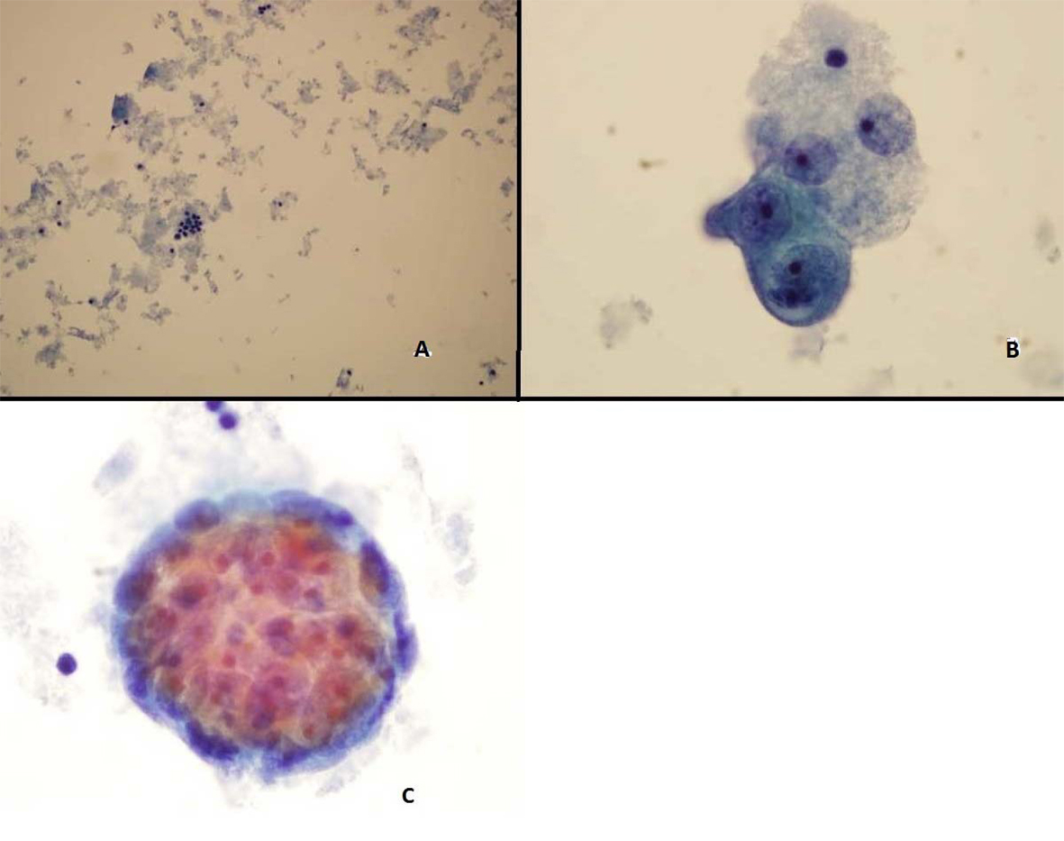 ![]() Click for large image | Figure 2. Pleural fluid Thin Prep demonstrating (A) Clusters of malignant epithelial cells in the background of necrotic cellular debris, 20 × (B) High power showing adenocarcinoma cells 100 × (C) 3-Dimensional clusters of adenocaricoma cells 100 × |