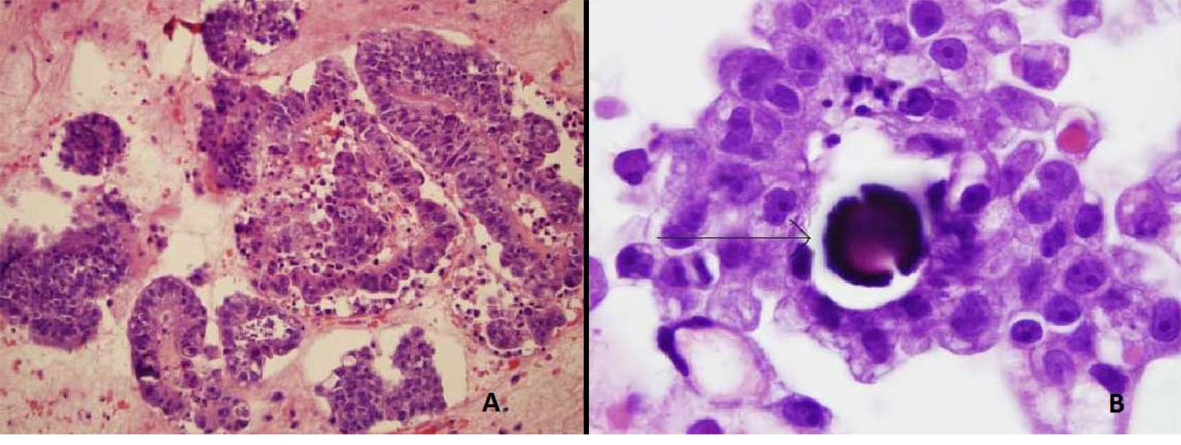 ![]() Click for large image | Figure 3. Pleural fluid cell block demonstrating (A) Papillary clusters of adenocarcinoma on H&E 20 ×. (B) Arrow showing Psammoma body on H&E 100 ×. |
