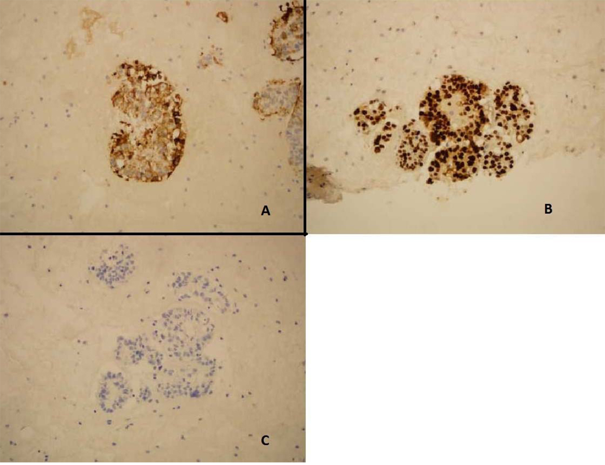 ![]() Click for large image | Figure 4. Pleural fluid cell block demonstrating (A) Immunostain positive for CK-7 (B) Immunostain positive for p53. (C) Immunostain negative for CK20. |