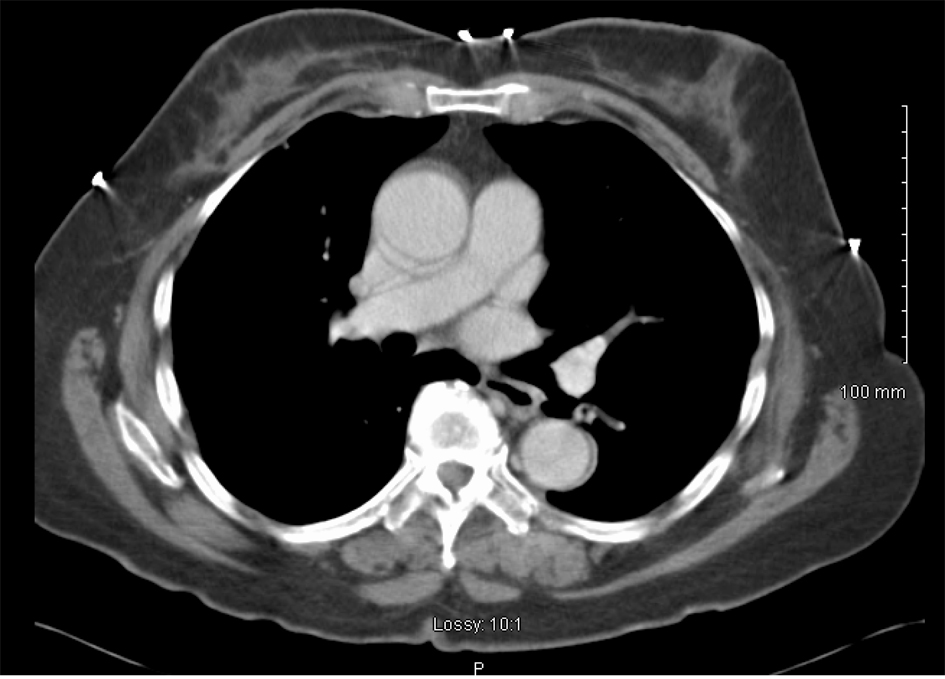 ![]() Click for large image | Figure 5. CT scan image after treatment demonstrating complete resolution of pleural effusion and nodularity. |