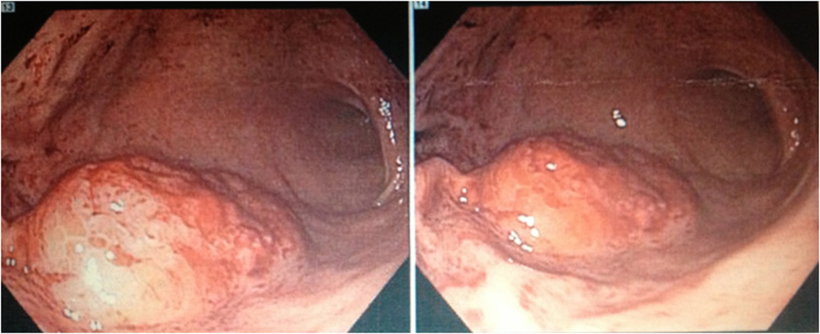 ![]() Click for large image | Figure 1. Esophagogastroduodenoscopy (EGD) revealing a large mass located in the gastric antrum with biopsy later showing the presence of clusters of malignant lymphoid cells with staining characteristics consistent with peripheral T-cell lymphoma. |