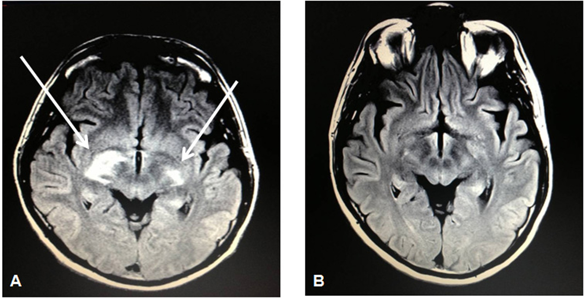 ![]() Click for large image | Figure 2. MRI brain showing bilateral signal enhancement (more on the right than left side) within the lateral subthalamus, midbrain, and internal capsule (A) followed by resolution of such lesions on a repeat MRI brain 5 months later (B) after 3 cycles of intravenous pemetrexed 900 mg/m2. |
