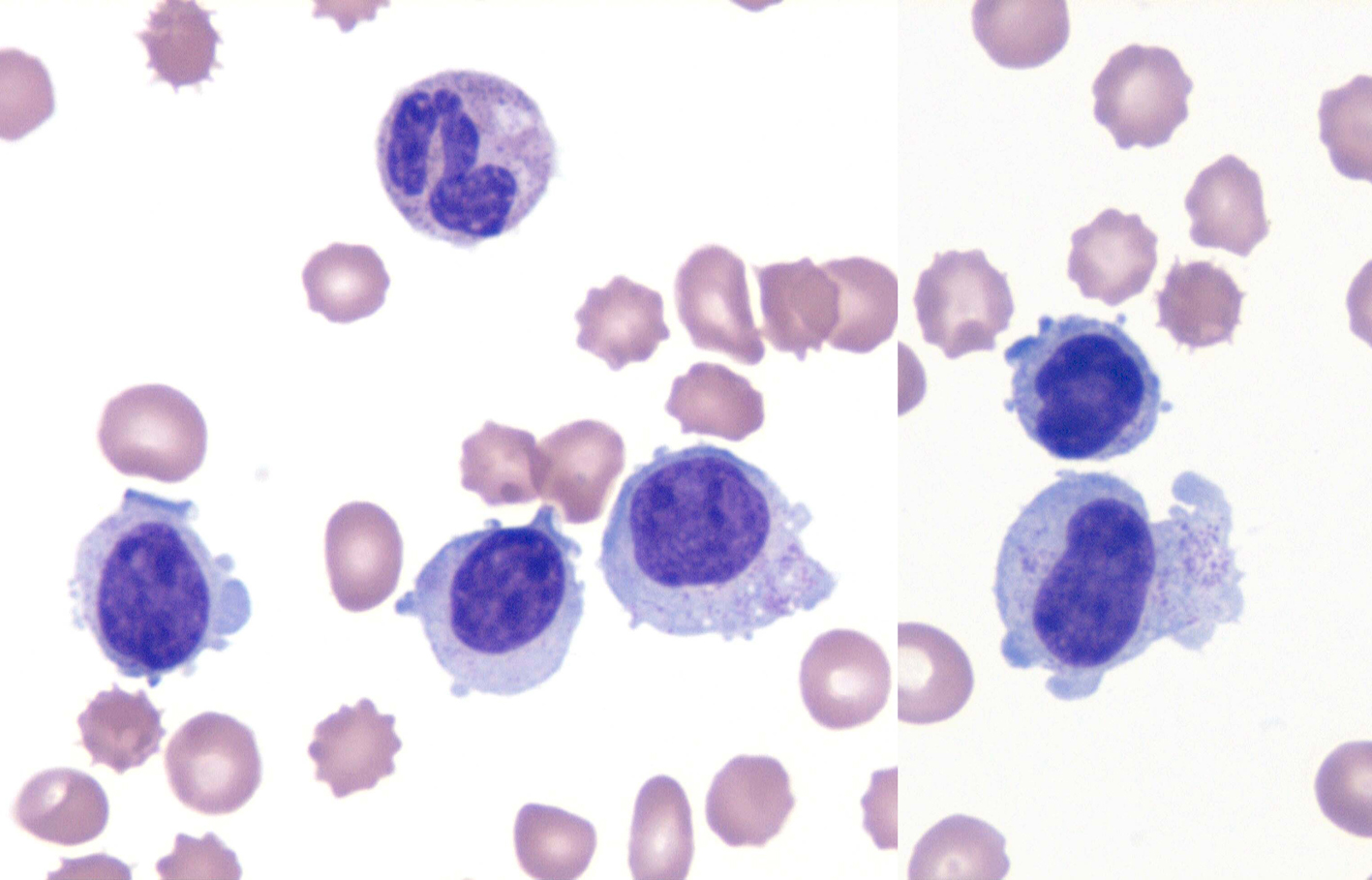 A 49-year-old man initially presented to an outside hospital 4 months prior with fever, night sweats and weight loss, along with mild splenomegaly and pancytopenia (WBC 2.3 × 103/μL, hemoglobin 8.8 g/dL and platelets 47,000/μL). Lactate dehydrogenase (LDH), triglycerides and liver function tests were within normal limits. Review of the peripheral blood film revealed a population of large granular lymphocytes (Fig. 1). On flow cytometry, these accounted for 60-70% of all lymphocytes and demonstrated a natural killer (NK) cell phenotype: CD56+, CD57+, CD16+, granzyme B+, TIA-1+, CD3-, CD5-, CD2- with weak expression of CD8. A bone marrow biopsy exhibited a small population of NK cells with an identical phenotype. In situ hybridization for EBV-encoded RNA (EBER) was negative. Cytogenetic studies revealed a normal male karyotype. A pathologic diagnosis of chronic natural killer cell leukemia (CNKCL) was rendered; however, some clinical features, especially his debilitating daily fevers, night sweats and weight loss, were worrisome for ANKL. Initial treatment specific for CNKCL was attempted with oral cyclophosphamide and prednisone resulting in a partial response in blood counts only. Subsequent treatment with weekly pentostatin resulted in clinical worsening requiring hospital admission. At that point, multi-agent chemotherapy consisting of dexamethasone, methotrexate, ifosfamide, L-asparaginase and etoposide (SMILE regimen) was initiated for a clinical diagnosis of ANKL [5, 7, 8]. This treatment regimen led to the resolution of his B-symptoms, and he was discharged home.