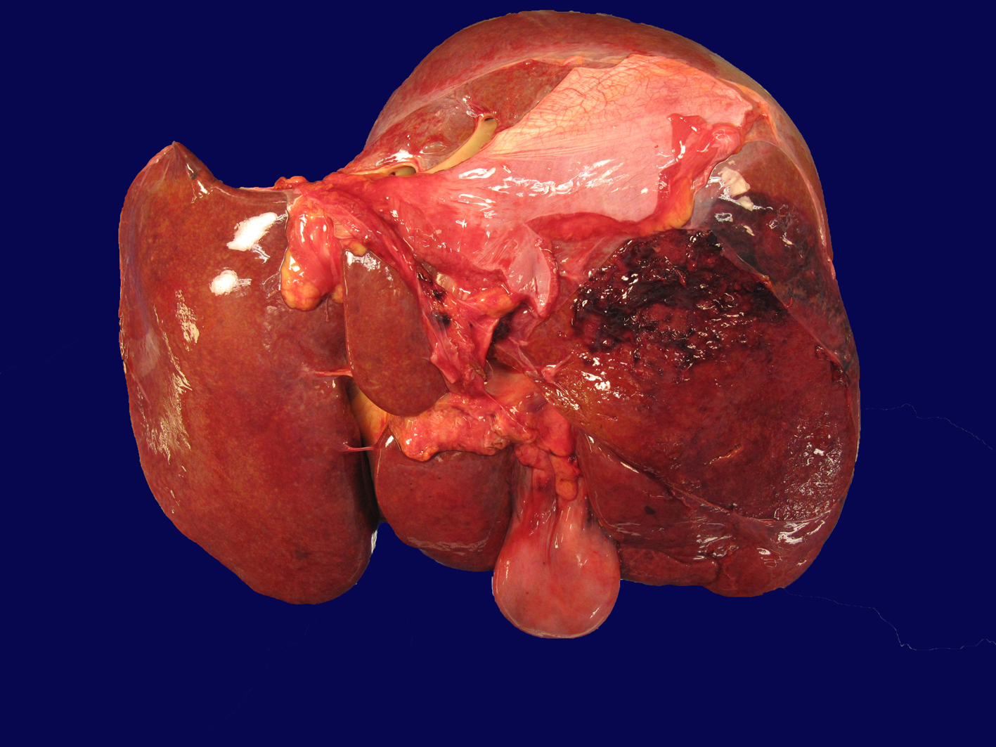 ![]() Click for large image | Figure 2. Liver with capsular and subcapsular parenchymal disruption on posterior surface of right lobe. This area was associated with an underlying intra-hepatic hematoma (6.5 × 5.5 × 5 cm). |