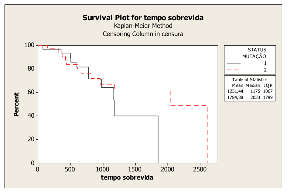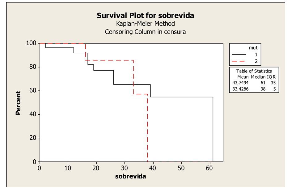 ![]() Click for large image | Figure 2. Kaplan-Meier Overall Survival Curves of patients with K-RAS mutated according to mutation in codons 12 and 13, P-value = 0.651. Legend: K-RAS mutated codon 12: 1; K-RAS mutated codon 13: 2. |