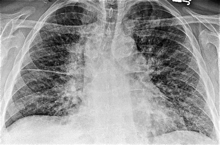 ![]() Click for large image | Figure 1. Chest X-ray on admission showed bilateral perihilar haziness and fluid in right transverse fissure consistent with pulmonary edema. |