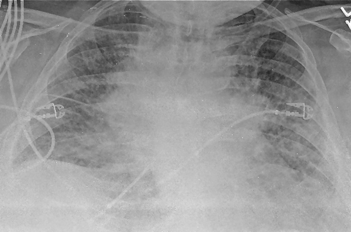 ![]() Click for large image | Figure 2. A repeat chest X-ray (day 7) revealed diffuse bilateral infiltrates or edema, predominantly interstitial in character with cardiomegaly (not significantly improved from admission, in spite of aggressive diuresis). |