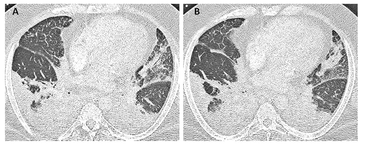 ![]() Click for large image | Figure 3. Patient’s CT scan of chest on day 7 (A, B) demonstrated mediastinal lymphadenopathy, diffuses pulmonary nodules, multifocal consolidations in right upper and lower lobe, lingular lobe, and left lower lobe as well as bilateral pleural effusion. |