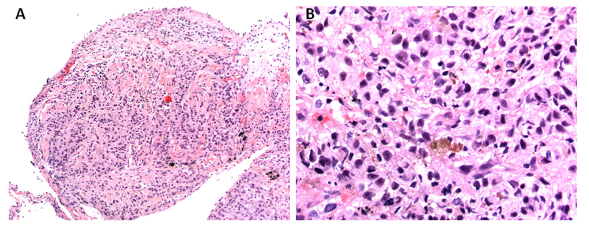 Given bilateral infiltrates and no significant cardiac dysfunction on echocardiogram, a diagnosis of ARDS was made. Moreover, his pO2/FIO2 ratio was less than 100 fulfilling Berlin criteria of severe ARDS definition [8]. An ARDS in the presence of lymphadenopathy, multiple pulmonary nodules as well as multifocal infiltrates conjure a broad differential. His bronchoscopy on eighth hospital day did not show any significant airway secretions or any mucosal lesions. Bronchoalveolar lavage revealed red blood cells of 76/mm3, white blood cell count of 850/mm3 neutrophil count 61%, lymphocytes 21%, monocytes 2%, and macrophages 6%. No malignant cells were seen. The bronchoalveolar lavage did not grow any virus, bacteria, fungus or mycobacteria. He received broad-spectrum antibiotics in form of vancomycin, azithromycin, pipercillin-tazobactam and micafungin without any significant improvement. Lymphoma has been uncommonly reported as causing ARDS but it is extremely unusual for melanoma to do so [9-11]. A lymphoproliferative disorder was excluded by flow cytometry of bronchoalveolar lavage. Subsequently on 12th day of admission, he underwent right upper lobe transbronchial biopsy (Fig. 4), which was positive for malignant epithelioid tumor, morphologically similar to malignant melanoma from his previous neck mass biopsy. Oncology was consulted for management of this patient’s melanoma. However, as per the oncologist’s opinion, no chemotherapy or biological agents could possibly improve his symptoms. Considering his very poor prognosis, the patient was transitioned to palliative care as per his family’s wish after 14 days of hospitalization.