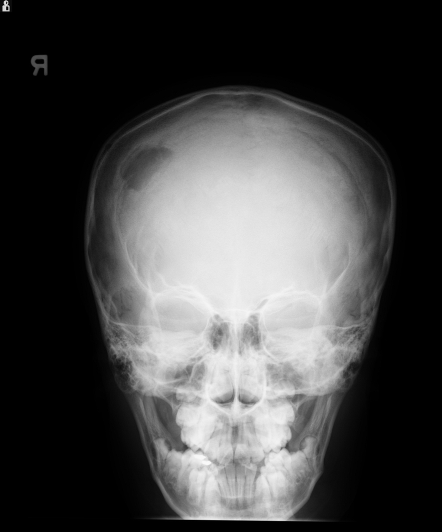 On physical examination, patient was well nourished and his vital signs were normal. Examination of the head revealed a swelling measuring 3 х 3 cm on the right parietal bone, hard in consistency, tender to palpation, with no other signs of inflammation. Examination of the ears, eyes, nose and throat showed no abnormalities. No lymph nodes were palpable in the neck, axillae or groins. Neurologic examination was normal. Rest of the physical examination did not reveal any abnormality.