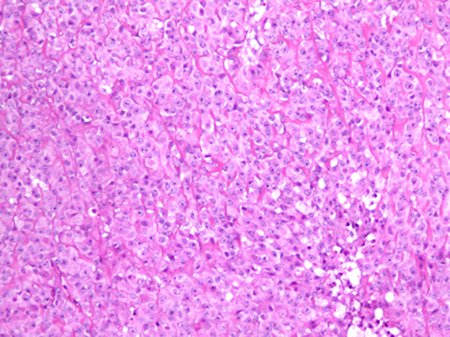 ![]() Click for large image | Figure 2. Light microscopic picture of SEF showing tumor cells arranged in hyalinized stroma (hematoxylin and eosin х 10). |