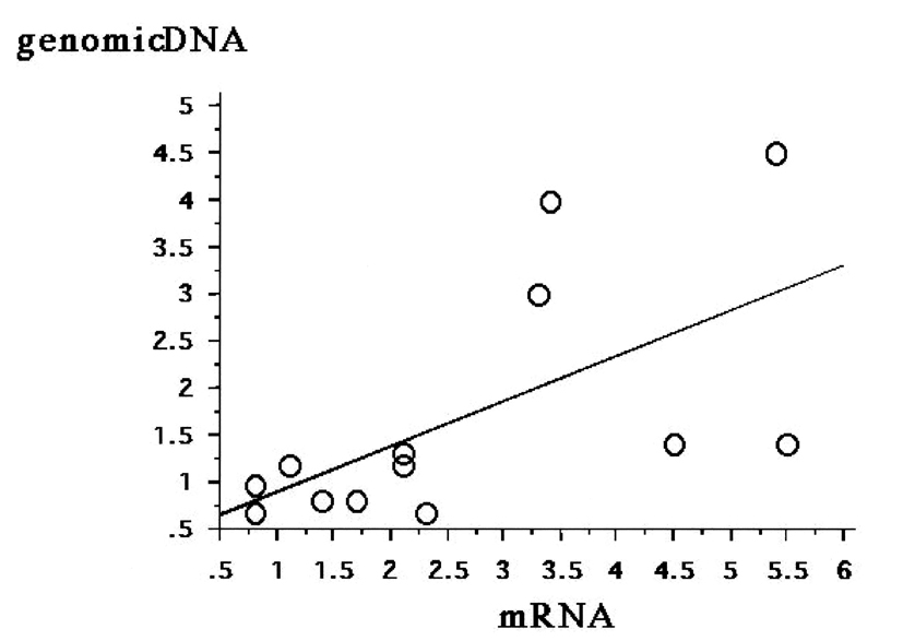DcR3 mRNA expression was extensive in five cases and faint in nine cases, as assessed by RPA (data not shown). The five strong cases had higher relative copy numbers of DcR3 genomic DNA than the nine faint cases (data not shown). The relative copy number of DcR3 genomic DNA correlated significantly (ρ = 0.755, P = 0.0067) with DcR3 mRNA expression (Fig. 2).