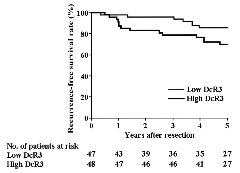 Results: The relative copy numbers of DcR3 genomic DNA correlated significantly with the levels of DcR3 mRNA expression (ρ = 0.755, P = 0.0067). In addition, lymphatic invasion correlated significantly with DcR3 gene amplification (P = 0.012). However, there was no correlation between the remaining clinicopathological factors and DcR3 gene amplification. In the univariate analysis, the recurrence-free survival (RFS) rate of patients who were positive for DcR3 gene amplification was significantly lower than that of patients who were negative for DcR3 gene amplification (P = 0.0271). Multivariate analysis showed that DcR3 gene amplification (P = 0.028) and disease stage (P < 0.001) remained significant independent predictors of RFS.