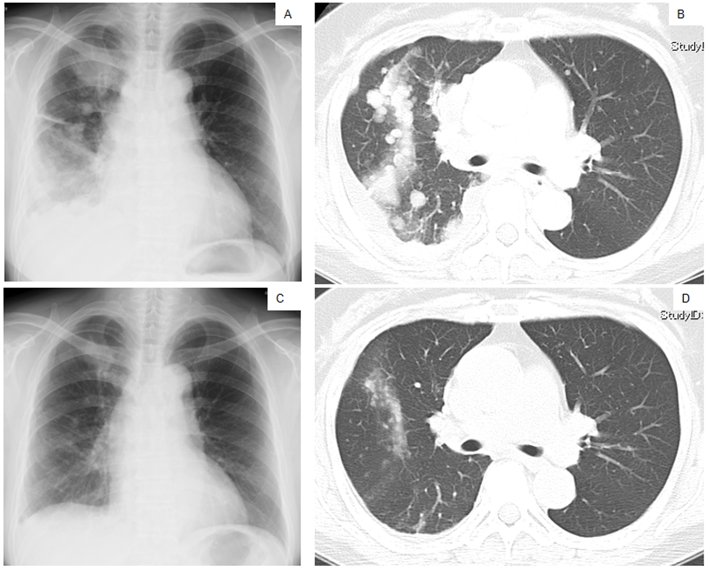 ![]() Click for large image | Figure 1. Chest X-ray films (A, C) and a CT scan of the middle lung fields (B, D) taken in April 2010 before first-line chemotherapy using carboplatin plus weekly paclitaxel (A, B), and taken in May 2010 after the second course of the first-line chemotherapy (C, D). |