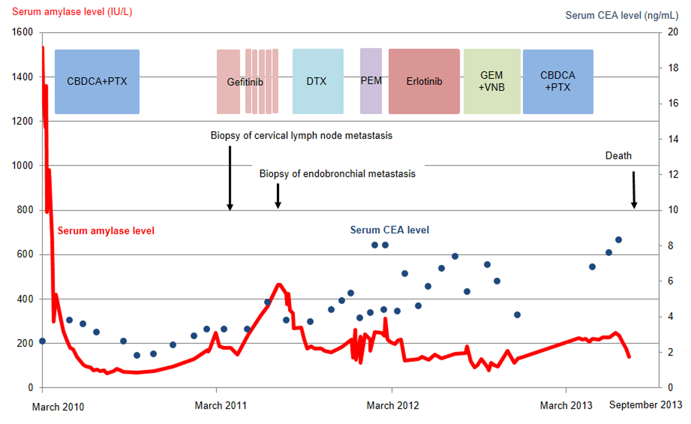 ![]() Click for large image | Figure 2. Serum amylase (red line) and CEA (blue dots) levels as a function of chemotherapy regimens. CBDCA, carboplatin; PTX, paclitaxel; DTX, docetaxel; PEM, pemetrexed; GEM, gemcitabine; VNB, vinorelbine; CEA, carcinogenic embryonic antigen. |
