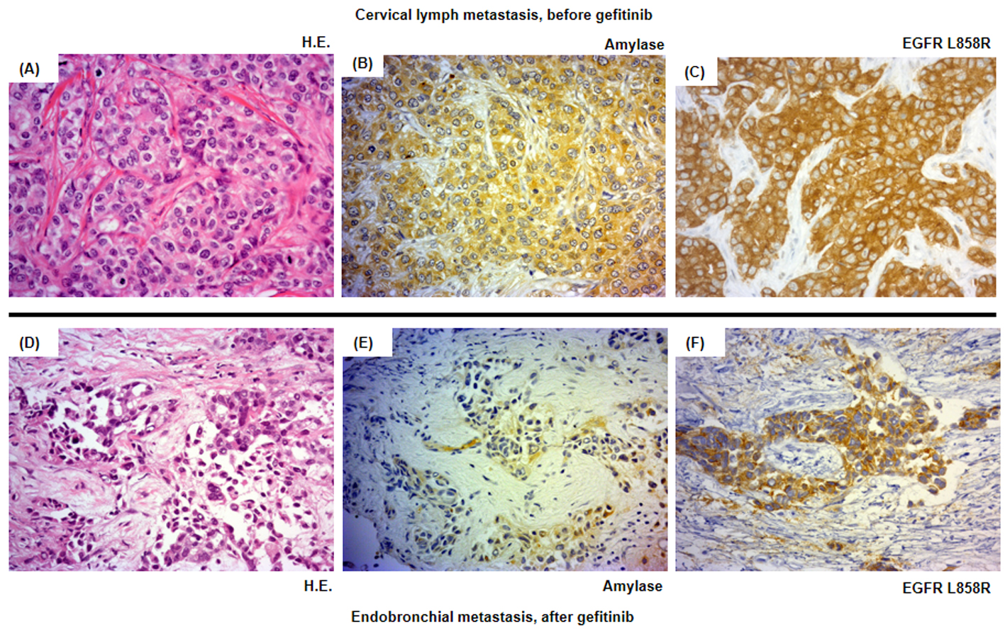 There were several limitations regarding our case study. First, biopsy sites differed before and after gefitinib treatment. We only detected amylase-producing cancer cells with an activating EGFR mutation before gefitinib treatment, and there were cancer cells that produced less amylase but still maintained an activating EGFR mutation after gefitinib treatment. We could not directly demonstrate that the cancer cells reduced or lost their own amylase production during the first- and second-line chemotherapies. Second, our immunohistochemical study did not quantitatively measure amylase production levels in cancer tissues. Although the endotracheal metastatic specimen suggested reduced or lost expression of amylase in cancer cells after gefitinib treatment, we could not directly compare amylase production levels between the different metastatic specimens before and after gefitinib treatment. Thus, we have to be careful in interpreting the immunohistochemical differences before and after gefitinib treatment.