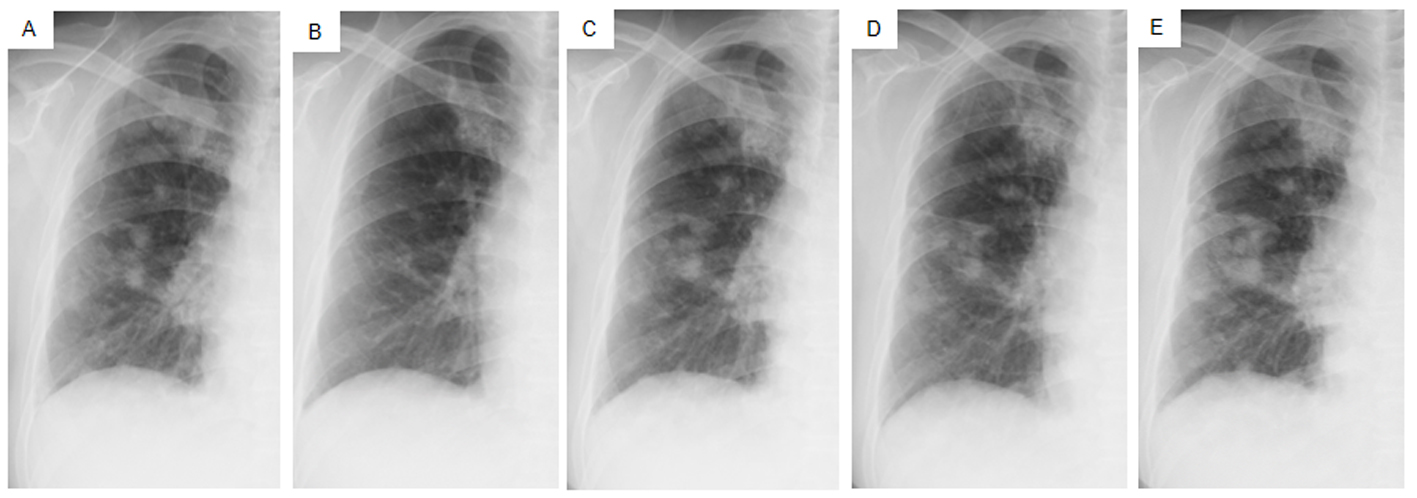 ![]() Click for large image | Figure 4. Chest X-ray films of the right lung field taken late in March 2011 before the administration of gefitinib (A), taken early in May at 1.5 months after initiating gefitinib and just before the suspension of gefitinib due to grade 3 elevation of alanine aminotransferase levels (B), taken early in June at the resumption of gefitinib on alternative days (C), taken in mid-July at the 1.5 months after the resumption of gefitinib (D), taken in mid-August after the documentation of progressive disease and 4 days after discontinuation of gefitinib (E). |