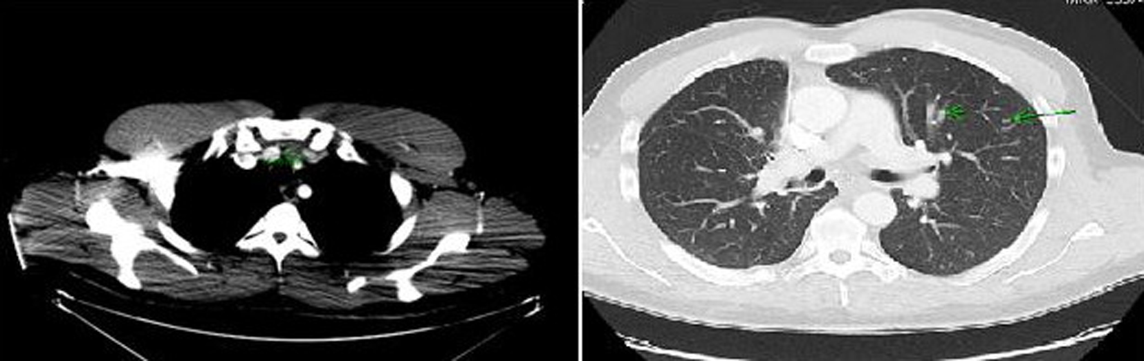 Computer tomography (CT) of the neck and chest confirmed a heterogeneous enhancing mass measuring 2.5 × 1.3 × 3.8 cm arising from the isthmus of the thyroid gland, extensive multiple bilateral lymphadenopathy in the neck and superior mediastinum, and multiple pulmonary nodules in both lung fields (Fig. 2).
