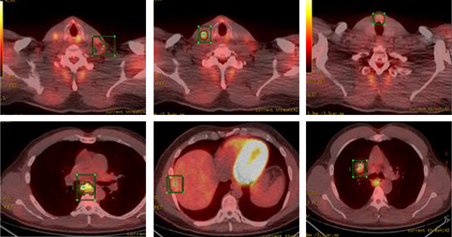 ![]() Click for large image | Figure 3. PET-CT showing FDG-avid nodular lesion in the thyroid isthmus, multiple bilateral cervical nodes, calcified mediastinal and hilar mass, patchy uptake in liver and sclerotic changes in skeleton suspicious for osseous metastasis. |