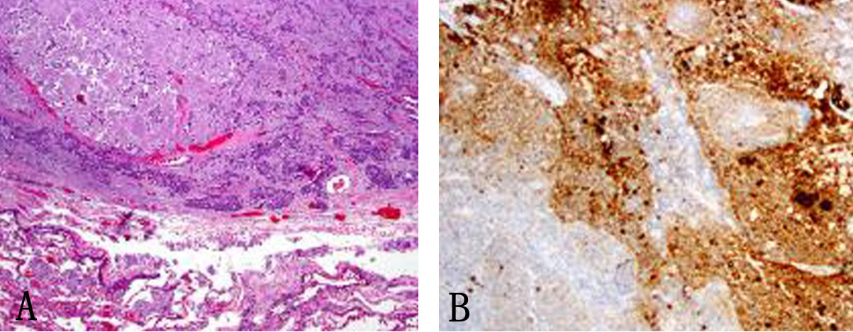 ![]() Click for large image | Figure 5. (A) Subcarinal lymph nodes positive for metastatic disease (× 40). (B) Synaptophysin stain on lymph node metastatis (× 40). |