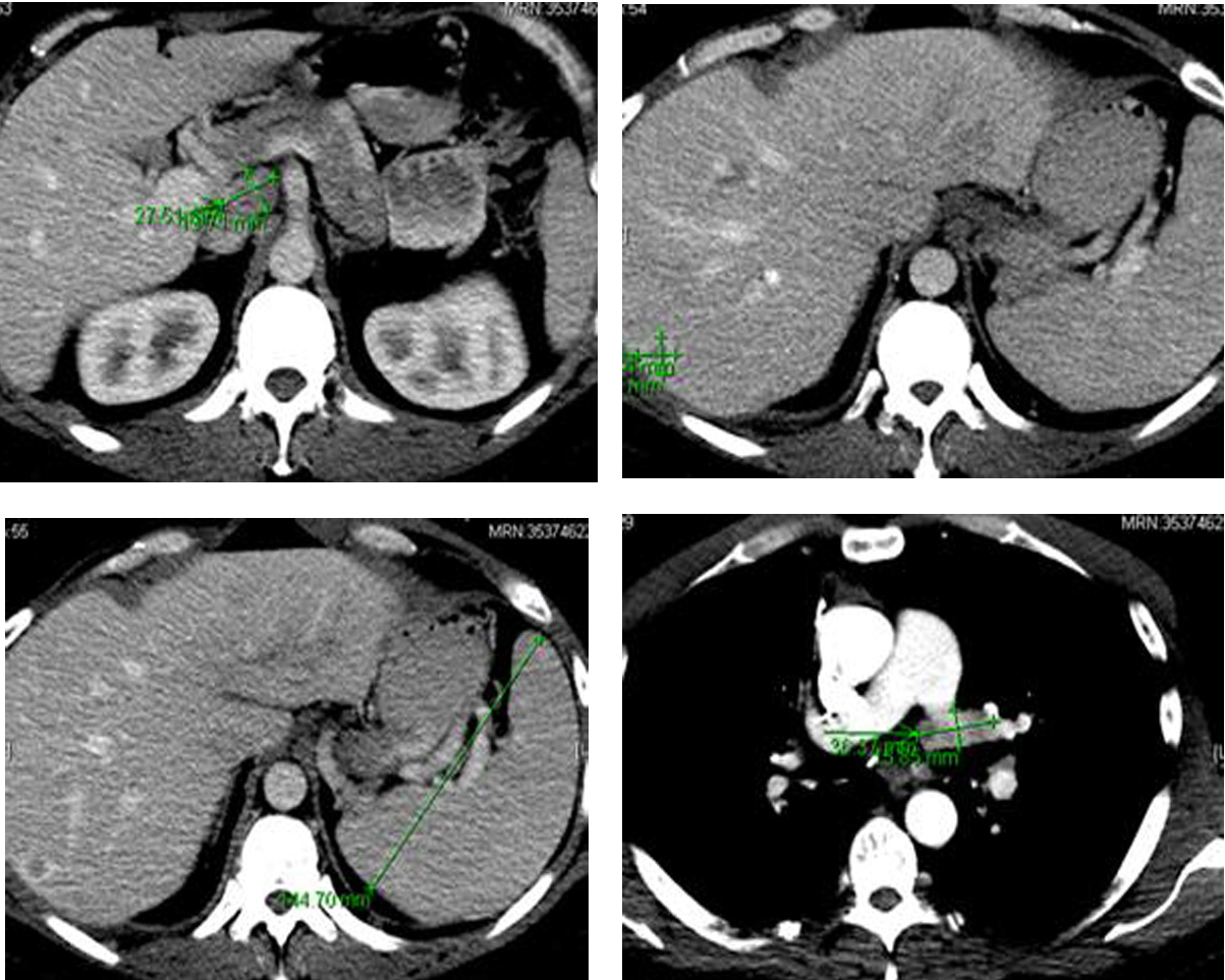 ![]() Click for large image | Figure 6. Computer tomography of the abdomen showing several hepatic metastasis, splenomegaly and abdominal adenopathy. |