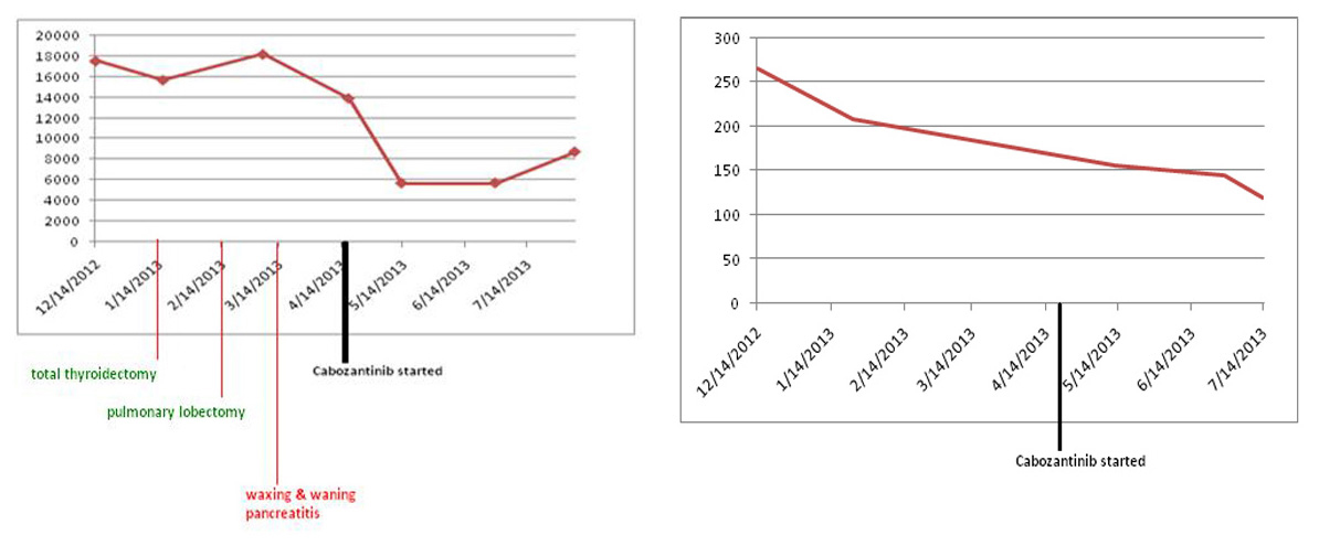 ![]() Click for large image | Figure 7. Both serum calcitonin and CEA levels following cabozantinib therapy. Y axis: serum calcitonin levels pg/mL; Y axis: serum CEA levels ng/mL. |