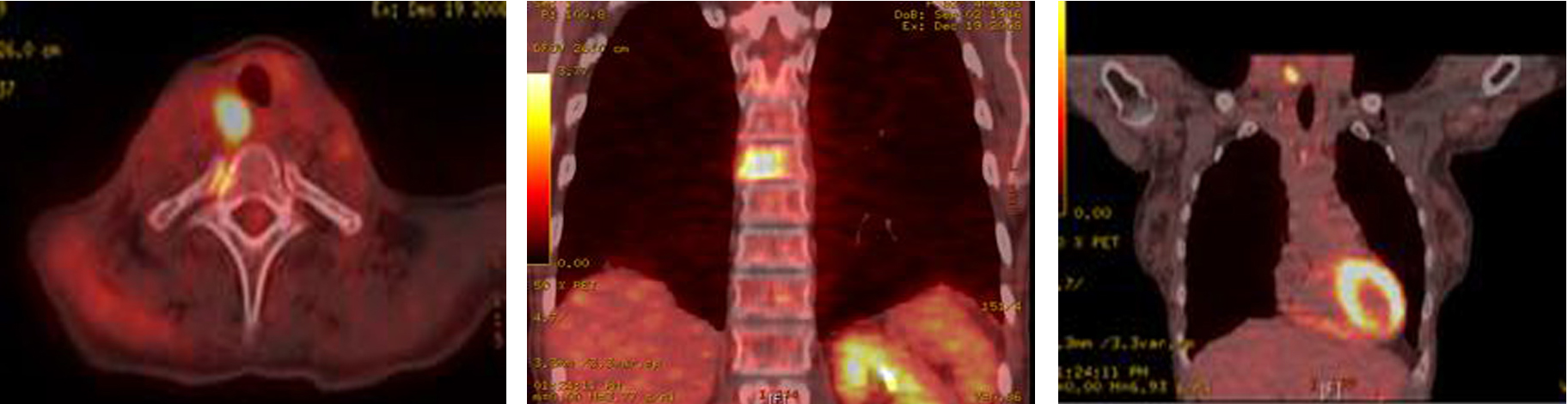 A total thyroidectomy with bilateral lymph node dissection along with superior mediastinal lymph node dissection was performed. Histopathology results confirmed medullary thyroid carcinoma. However, 3 months later, PET-CT showed right tracheoesophageal groove recurrence with diffuse spinal metastasis (Fig. 8).