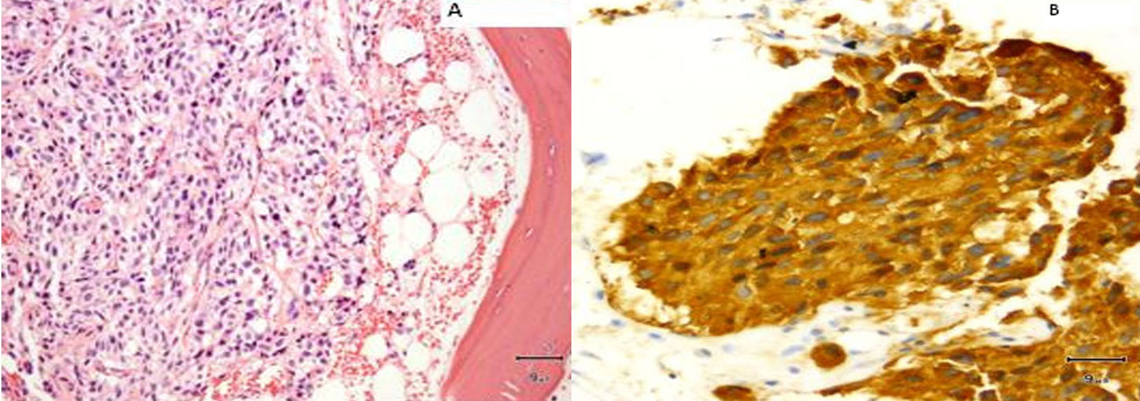 ![]() Click for large image | Figure 9. (A) Vertebral biopsy showing metastatic medullary thyroid carcinoma. (B) Synaptophysin stain on vertebral metastasis. |