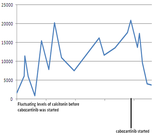 ![]() Click for large image | Figure 12. Serum calcitonin levels following cabozantinib therapy. Y-axis: serum calcitonin in pg/mL. |