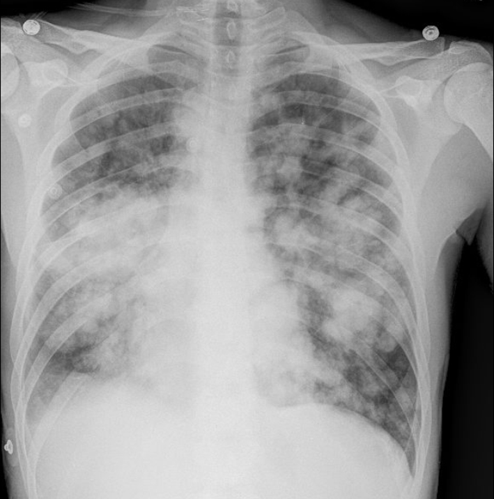 ![]() Click for large image | Figure 1. Chest X-ray showing bilateral rounded airspace opacities. |