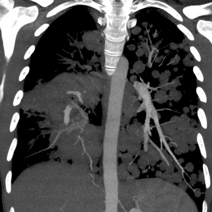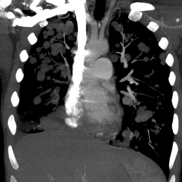 ![]() Click for large image | Figure 2. Coronal section of CT chest showing bilateral cannonball pulmonary nodules. |