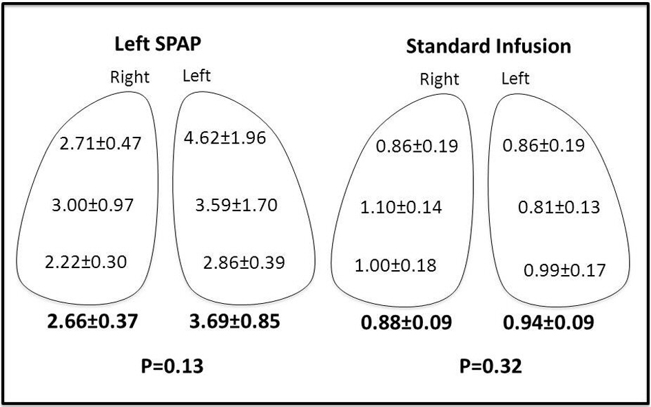 Lung concentrations of gemcitabine were higher on the left than right in the SPAP group (2.66 vs. 3.69); however, this was not statistically significant due to high sample variability. This is consistent with a previous study which demonstrated heterogeneous drug distribution with isolated lung perfusion as compared to CVI [9]. Our study showed very little variability in the gemcitabine concentration in the CVI group.