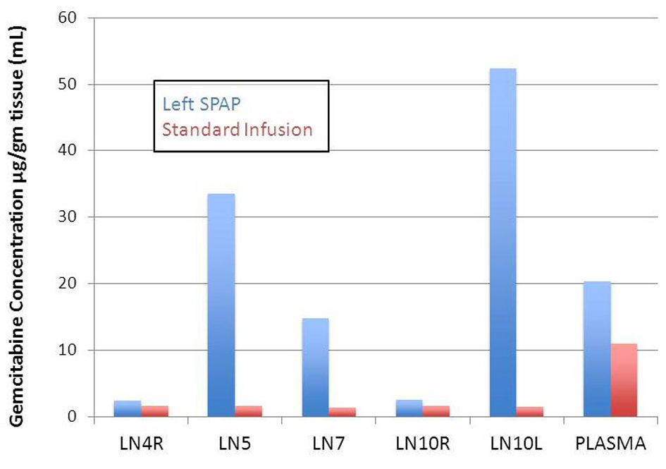 Methods: Left SPAP was performed using gemcitabine on five swine and compared with standard central venous infusion in controls. Samples were taken from lung, kidney, liver, plasma, and lymph nodes. Tissue was measured for gemcitabine concentration using mass spectroscopy.