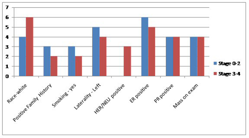 Between January 2000 and November 2013, we found a total of 2,129 cases of breast cancer patients at our institute. Out of these 2,113 (99.24%) were female and 16 (0.75%) were men. Four MBC patients were excluded because their complete charts could not be found in the medical records department. Six patients (50%) had one indicator, four (33%) patients had two indicators and one (8.3%) patient had all three. Eleven (91.6%) patients had precursors suggestive of hyperestrogenemia. Only one (8.33%) patient did not have any surrogate marker indicator of high estrogen levels. Two (16%) were black and 10 (83.33%) were white. Mean age was 61.75. Five (41%) had a first degree relative with a malignancy. Laterality was nine (75%) in the left breast, three (35%) in right breast. Eight (66.6%) found a mass on physical exam. Five (41.6%) had a positive smoking history. One patient had no data in the chart. Remaining all 11 (91.6%) had non-TNBC. One patient did not have complete documentation. Five (41.6%) had mastectomy, six (50%) received RT, four (33.3%) received chemotherapy and another four received hormone therapy. In terms of stage, four (33.3%) had stage 4, two (16.6%) stage 3B, two (16.6%) stage 2B, two (16.6%) stage 2A, one (8.33%) had stage 1C and one had stage 0. HDL data were available in seven (58.3%) with mean of 37, albumin in 10 (83.3%) with mean of 3.61, BMI in 11 (91.66%) patients with a mean of 33.30. Within subgroups, two patients were black and 10 white. Both black patients had LE disease (stage 0-2). Of the white patients, four (40%) had limited disease while six (60%) had extensive breast cancer. Family history assumed a similar distribution as three (60%) of patients with negative family history for cancer had limited disease and two (40%) had extensive one, same numbers applied for family-history-positive population. Three (60%) of patients with limited disease smoker and two (40%) did not. As for laterality, a total of nine patients had left-sided breast cancer, of whom five had had limited disease and four fell into the extensive disease category. The hormonal status for most patients were HER/NEU negative (seven out of 10 patients, two patients did not have this information on file), ER positive (11 out of 12) and PR positive (eight out of 12). Estrogen status: Low HDL was seen in three out of seven patients, low albumin in four out of 10 and obese BMI in nine out of 11 patients. Finally, 11 (91.6%) out of 12 patients had at least one indicator of high estrogen. No significant change in prevalence of these markers was seen when comparing patients with limited and extensive disease. Further details are presented in Figures 1, 2, and Tables 1, 2.