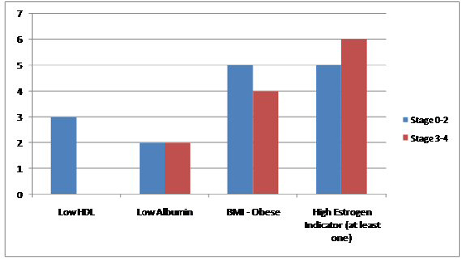 Methods: A 13-year retrospective review of the male breast cases at University of Florida College of Medicine’s Tumor Registry was conducted. Data regarding certain clinic-pathological risk factors and MBC were collected and reviewed. Main surrogate indicators for elevated estrogen were examined, namely, low HDL (< 40 mg/dL), low albumin (< 4 g/dL) and high BMI (> 25). Presence of any one of these surrogates was seen as an indirect marker for high estrogen level. For cancer staging, the American Joint Committee on Cancer (AJCC) staging system was used. Stages 0-2 were grouped together as they are less extensive compared to stages 3-4 (also grouped together) which represent extensive disease. Univariate analysis was conducted using STATA 13 to do Fischer’s exact test as cross-tables showed cell counts of five or less. The main comparison was that between extensive MBC (stages 3-4) and non-extensive breast cancer (stages 0-2).