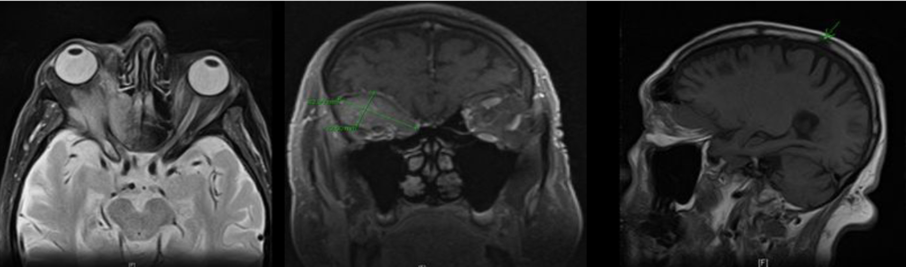 ![]() Click for large image | Figure 1. MRI of the head showing a right intra-orbital mass measuring 4.3 × 2.3 cm, extending into the anterior cranial fossa (superiorly); lamina papyracea, posterior ethmoid sinus and anterior lateral sphenoid sinus (medially); and posterior lateral orbital wall and sphenoid wing (laterally); sclerotic lesion in the right parietal bone also noted. |