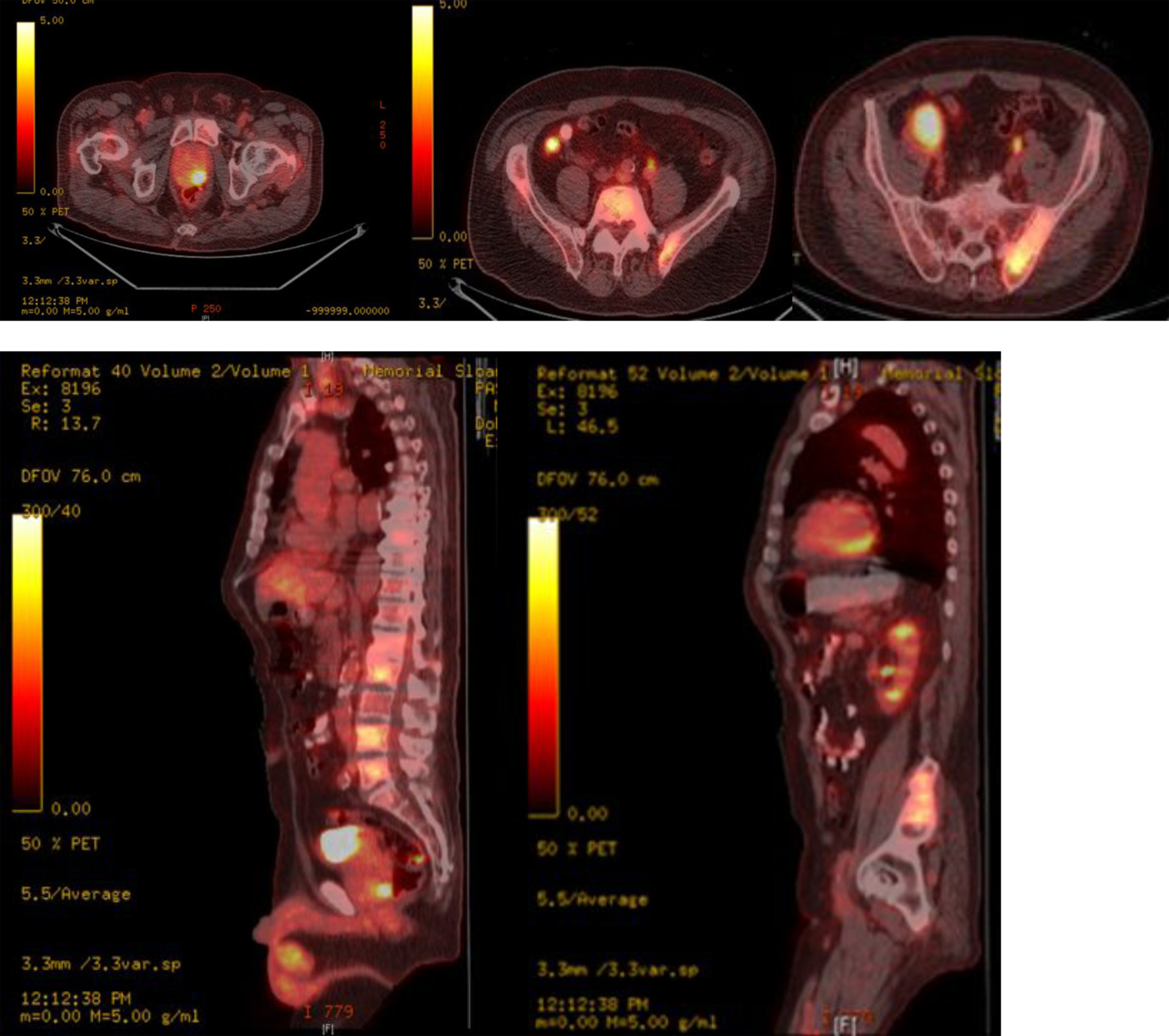 ![]() Click for large image | Figure 2. Whole body PET-CT showing FDG avid uptake in posterior lobe of prostate, axial spine, iliac bones and bilateral iliac lymph nodes. |